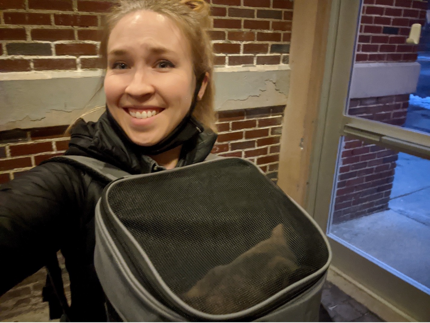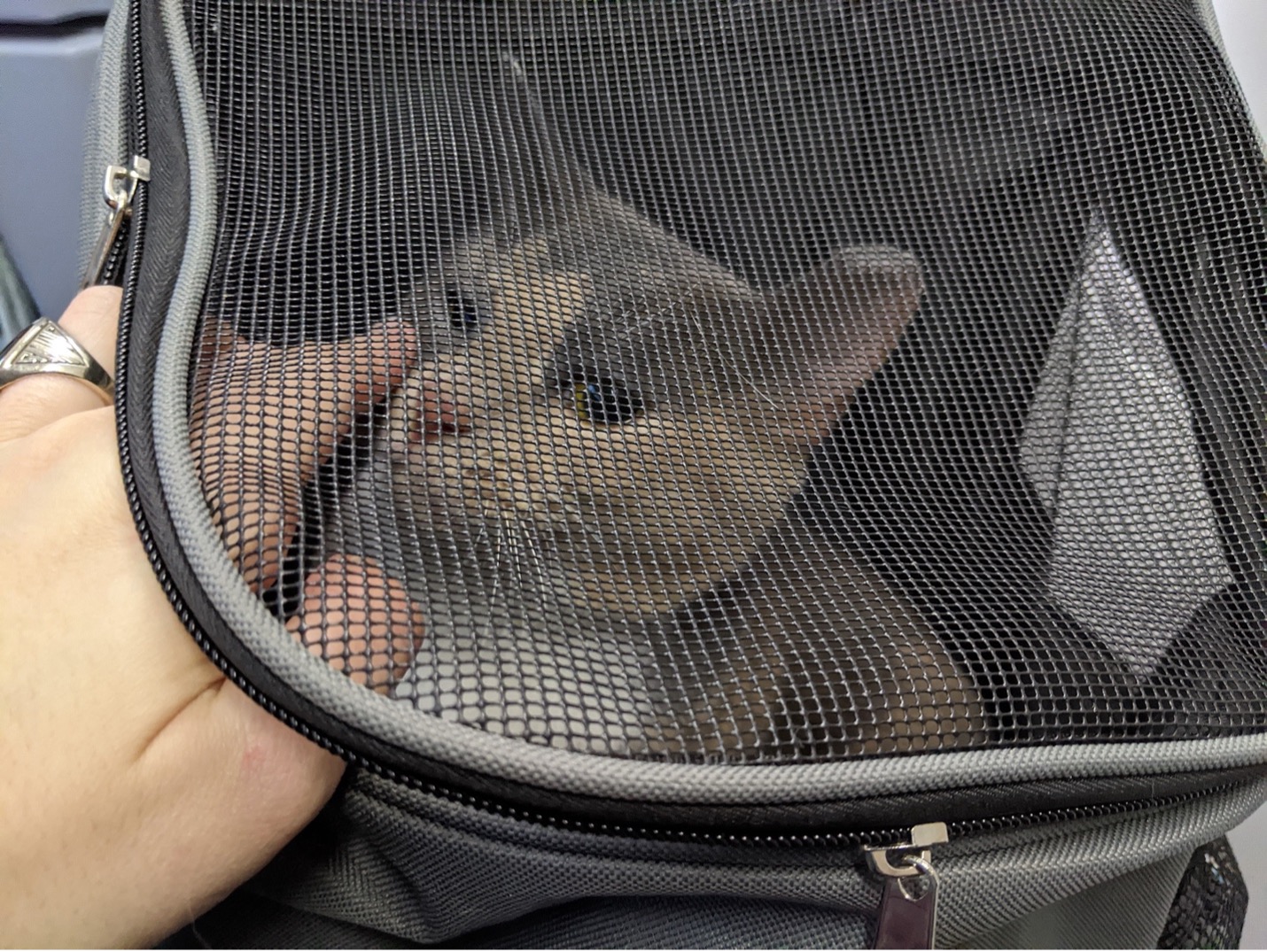 Travelling light is my only way to go, so I had opted to wear a small backpack as carry-on and strap the cat to my front so I could keep an eye on her. It was surprisingly fun. More people than I expected eye-smiled at me behind their masks as I hoofed it through the terminal.