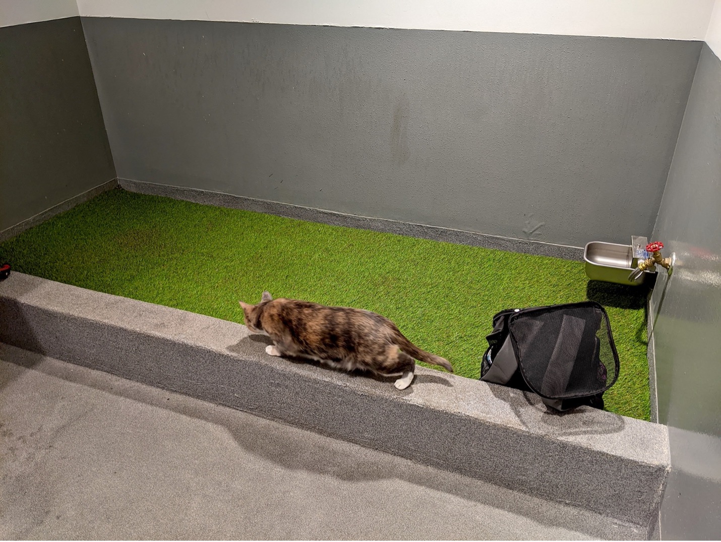 The pet relief area was essentially a small closet with a sunken area of artificial grass and sources of water in the form of hoses and a sink (obvious applications there). I freed Laverne from her canvas cage and let her poke around a bit. She did so apprehensively. I can only imagine what smells she was experiencing.
