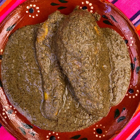 Next is the one that takes the top layer of my tongue off. It’s the mole verde. This type makes enthusiastic use of jalapeño peppers, cilantro, tomatillos, and some pumpkin seeds.